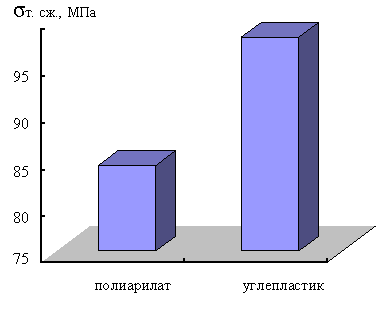 полиарилата и углепластика на его основе: предел прочности при сжатии (а) и