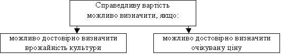 Первісна вартість культури може бути точно визначена, адже всі витрати, які понесені на посів і догляд за ними накопичені на рахунку 23. Що ж до їх оцінки за справедливою вартістю, то необхідно, щоб було дотримано двох умов (див. рис.).