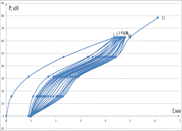Перед одинадцятим циклом навантаження, повні прогини становили 4,98 мм, а