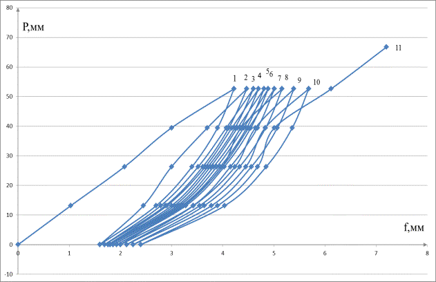 десятому циклі навантаження значення повних та залишкових прогинів склало 6,48