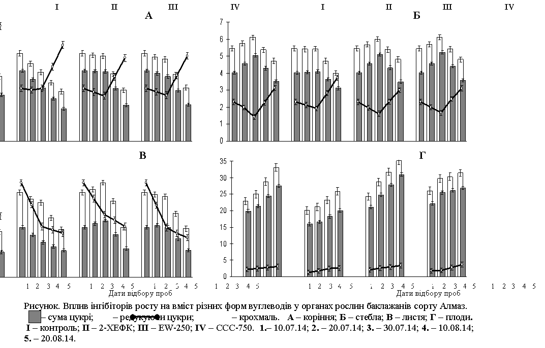 EW-250 та ССС-750 посилювали накопичення цукрів у листках рослин баклажанів за