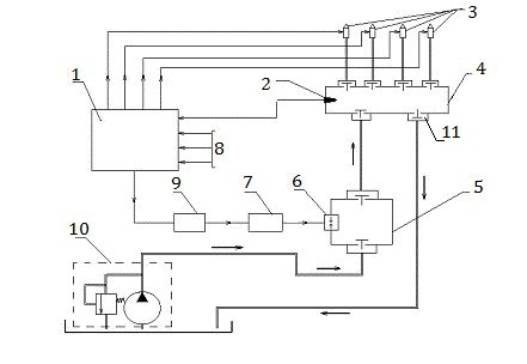 На рис.1 обозначено: 1 – электронный блок управления; 2 – датчик давления гидроаккумулятора; 3 – электрогидравлические форсунки двигателя; 4 – гидроаккумулятор; 5 – электрогидродинамический насос высокого давления; 6 – высоковольтные электроды; 7 – блок повышения напряжения; 8 – информация от датчиков системы; 9 – блок задания частоты (или транзисторный коммутатор); 10 – система подпитки с насосом и переливным гидроклапаном; 11- электрогидравлический клапан.