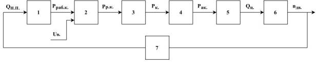 На рис.2 обозначено: 1 – объем рабочей камеры насоса Vркн; 2 – камера разряда с двумя электродами; 3 – гидравлические потери при движении паротопливной смеси по рабочей камере насоса до обратного гидроклапана; 4 – расход паротопливной смеси через гидроклапан Qак; 5 – релаксация паротопливной смеси и расход топлива через форсунки двигателя; 6 – механизмы двигателя, включая цилиндры двигателя; 7 – обратная связь в виде привода к насосу подпитки.