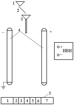 1-загрузочный бункер, 2-лоток, 3- направляющий, 4- электроды сепарационной камеры,