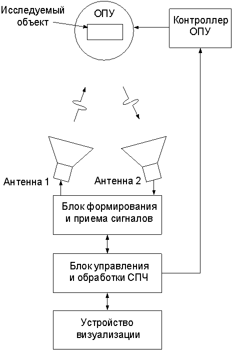 Модель объекта размерами около 1 м предлагается устанавливать на опорно-поворотное устройство (ОПУ), управление которым осуществляется блоком управления и обработки СПЧ при помощи контроллера ОПУ. В процессе измерений исследуемый объект предложено облучать зондирующими сигналами, подаваемыми на излучающую антенну с выхода блока формирования и приема сигналов (БФПС). Передающая антенна (антенна 1) должна быть широкополосной в соответствии с диапазоном перестройки частоты. Отраженные от исследуемого объекта импульсы должны улавливаться приемной антенной (антенна 2) и поступать в приемный тракт БФПС, в котором происходит преобразование частоты, усиление (при необходимости) и перевод отраженных и принятых по боковым лепесткам излученных сигналов в цифровой вид. Оцифрованные сигналы поступают на блок управления и обработки СПЧ, где по специальному алгоритму [4,8] происходит формирование импульсных характеристик (ИХ) объекта. Огибающая ИХ исследуемого объекта должна выводиться на экран устройства визуализации.
