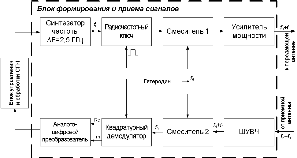 Отраженные от объекта импульсы, пройдя приемную антенну, после усиления широкополосным усилителем высокой частоты (ШУВЧ) поступают на 2-й смеситель. После понижения частоты до n-й перестроичной сигналы на этой n-й частоте поступают на вход квадратурного демодулятора. на который в качестве опоры подается сигнал с выхода синтезатора частоты. Квадратурный демодулятор раскладывает принятые сигналы частоты fn на квадратурные составляющие Re и Im. Эти составляющие поступают на входы аналого-цифрового преобразователя (АЦП), в котором оцифровываются и поступают в блок управления и обработки СПЧ для формирования комплексной ИХ объекта в соответствии с разработанным алгоритмом.