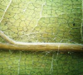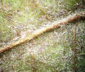 незначительное опушение, которое присутствует преимущественно на жилках. Развитие мицелия на верхней стороне листа