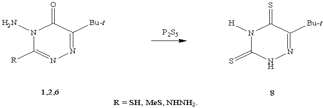 получен 4-амино-6-трет-бутил-3-гидразино-5-оксо-1,2,4-триазин (2). Замещение тиоксо(метилмеркапто)группы