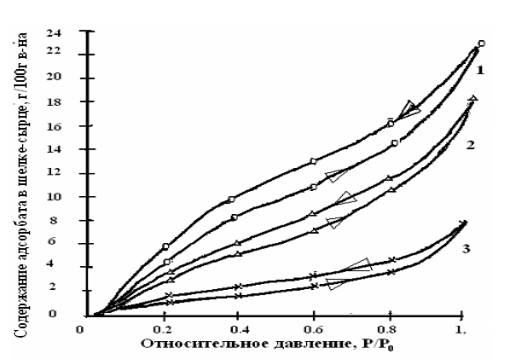 Изотермы сорбции и десорбции шелком-сырцом паров приведены на рис.1. Отсюда