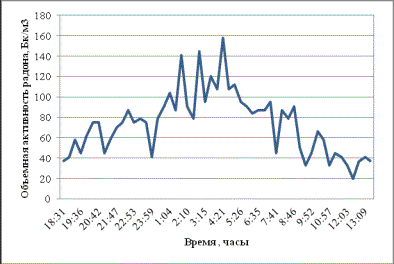 Средняя объемная активность радона в течение сутки составляет 44 Бк/м3.