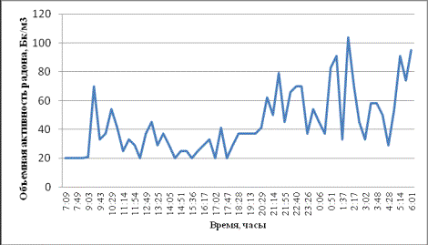 Средняя объемная активность радона в течение сутки составляет 44 Бк/м3.