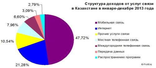 Различные услуги в общем объеме доходов телекоммуникационного сектора Казахстана имеют следующие доли: мобильная связь — 47,7%, интернет — 21,3%, местная телефонная связь — 8%, междугородняя телефонная связь — 6,6%, прочие услуги связи — 10,5%. Наглядно увидеть структура доходов от услуг связи в Казахстане в январе-декабре 2013 года можно на рисунке 1.