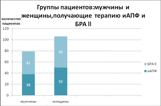 женщин и АПФ получали 50 человек, БРА – 56 человек. Группы пациентов: мужчины и женщины, получающие терапию БРА II и иАПФ
