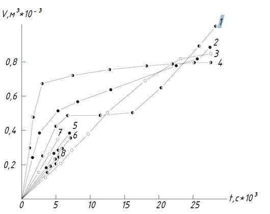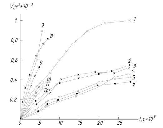 объемных скоростях пропускания газовых смесей (V-объем поглощенной смеси, t-время):