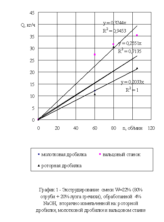 На основании полученных результатов построены зависимости изменения производительности Q и удельной энергоемкости Э (при различных скоростях вращения шнека пресс-экструдера), в зависимости от типа устройства, на котором измельчалось исходное сырье (рисунок 1).