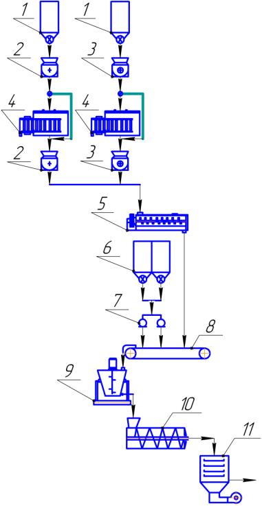 6, форсунки 7, ленточный транспортер 8, мешалка 9, экструдер 10, сушилка
