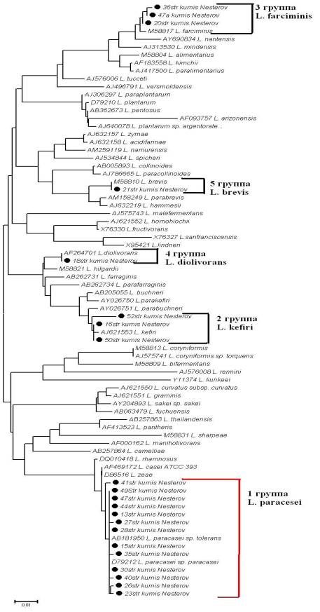 идентификации 1 группа бактерий была идентифицирована как L. paracasei; 2 группа - L. kefiri; 3 группа - L. farciminis; 4 группа - L. diolivorans, 5 группа - L. brevis.