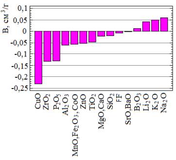 Рисунок 1. − Аддитивные коэффициенты водостойкости (В, см3/г) наиболее вероятных компонентов эмалевых фритт