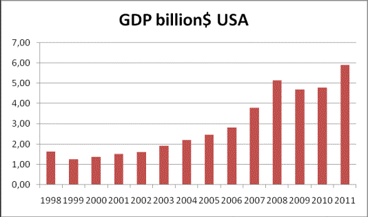 the period of 1998-2001 the indicator of GDP rose from 1.65 to 5.92 billion