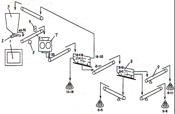 1 – кабина управления; 2 – вибрационный питатель; 3 – бункер; 4 – электромагнит; 5 – металлоискатель; 6 – конвейер; 7 – валковая дробилка; 8 – агрегат сортировки; 9 – конвейер с конвейерными весами.