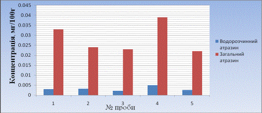 атразину коливається від 0,022 до 0,039 мг/100 г ґрунту та не пере-вищує ГДК,