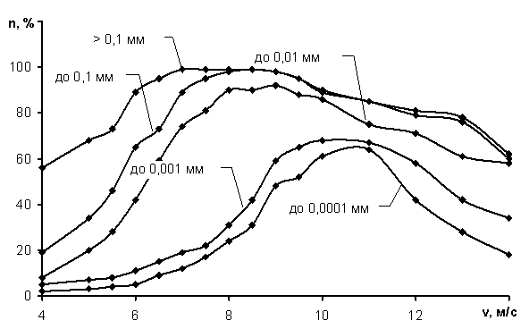 Рисунок 2 – Залежність ефективності очистки пилу (n) різної дисперсності від швидкості руху повітря (v) у вхідному патрубку циклону ЦОЛ–1