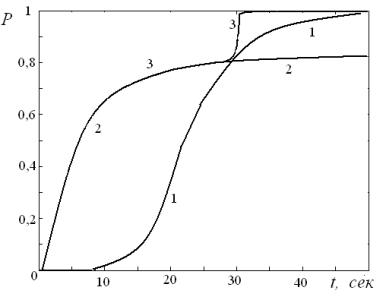 временная зависимость доли мономеров, достигших поверхности (величина P). Вычисления произведены