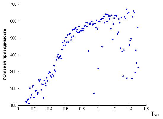 условная проводимость возрастает с ростом условной температуры. При достижении точки фазового перехода имеет