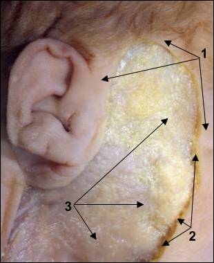 позаду гілки нижньої щелепи, в занижньощелепній ямці. Шкіра ділянки рухома, підшкірна жирова клітковина та
