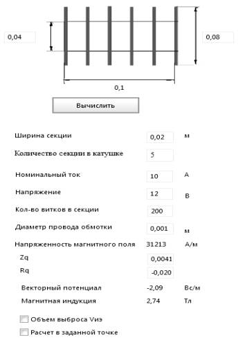 Исходными данными являются величины тока и напряжения, подаваемые на индуктивный элемент, а также конструктивные параметры катушки, такие как: ширина секции, их количество, внутренний и внешний радиальные размеры секции, а также число витков одной секции и диаметр поперечного сечения обмотки.