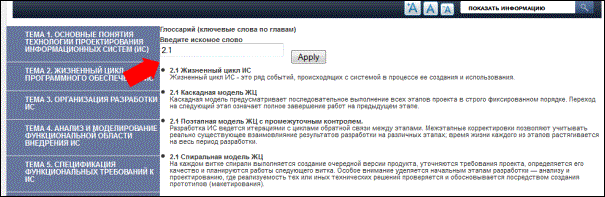 Для подключения интерактивного блока «Поиск по содержимому» спрограммирован вывод подробного поиска в определенном виде: в окне результатов идет перечисление ссылок на лекции с подчеркиванием желтым фоном искомого слова.