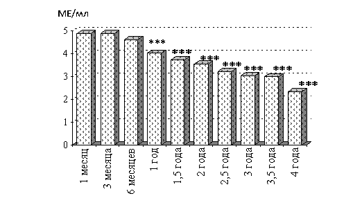 среднеарифметрическая концентрация антител составила 4,90+0,04 МЕ/мл. Отмечали среднегодовое снижений титра АТ