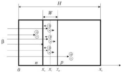 граница перехода, W−ширина области пространственного заряда, H−толщина