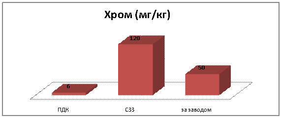 составляет 120 мг/кг, что превышает ПДК в 20 раз, за пределами территории содержание хрома значительно ниже
