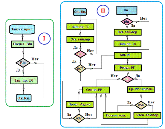 работы приложения (I) и блок работы приложения после нажатия на кнопку "Нажми