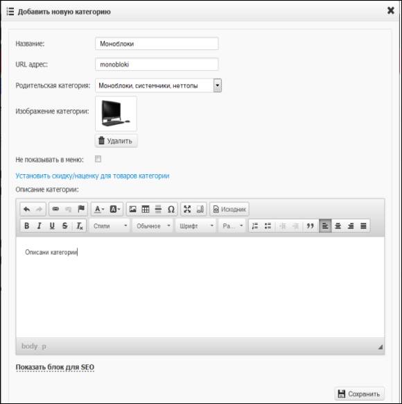 товара, URL адрес, родительскую категорию, добавляет изображение товара,