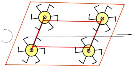 моментов, когда три колеса окажутся в одной фазе, а третья опора пробегает,