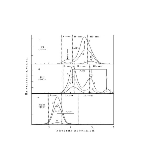 приведены спектры рентгенолюминесценции (РЛ) кристаллов KI (a), RbI (б) и NaBr (в)