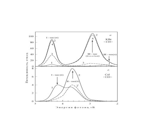 Спектр РЛ кристалла RbI состоит также из трех полос: s (3,89 эВ), Ех (3,1 эВ) и p (2,3 эВ), соотношение интенсивностей которых также изменяется в зависимости от степени низкотемпературного сжатия. В кристалле RbI с ростом степени относительной одноосной деформации (кр. 2 и 3 относительно 1) интенсивность p-свечения постепенно уменьшается, а взамен этого интенсивность Ех (3,1 эВ)-свечения возрастает, т. е. происходит перераспределение между ними. Отметим, что также растет интенсивность s-люминесценции (кр. 3, рис. 1 б), относящаяся к структуре АЛЭ с центральносимметричной конфигурацией. На первый взгляд существует противоречие в перераспределении полос свечения между p- и Ех-свечениями в кристаллах KI и RbI при низкотемпературной деформации. В кристалле KI после деформации интенсивность Ех-свечения уменьшается и увеличивается интенсивность p-свечения, а в кристалле RbI, наоборот.