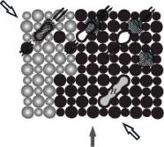 Фактически при низкотемпературной деформации (100 К) по направлению <100> с торца кристалла ЩГК реальное сжатие решетки происходит по кристаллографическому направлению <110>, которое соответствует направлению АЛЭ в ГЦ ЩГК. Другими словами, механическая внешняя нагрузка будет действовать по направлению <100> кристалла, а эффективное сжатие решетки будет происходить по длине АЛЭ, так как наилучшее скольжение будет соответствовать направлению <110> (рис. 3).