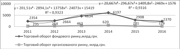 Обсяги торгів на фондовому та організованому фондовому ринку за 2011-2016 рр. (розроблено за даними [1])