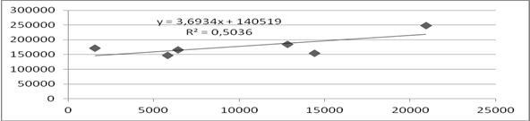 характеризується функцією у = 3,6934x + 140519 (рис. 3). Низький показник коефіцієнту