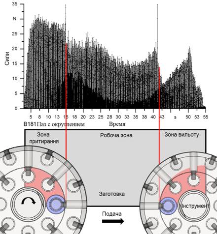 Во временном отрезке от 30,016 до 30,017 при шлифовании можно заметить
