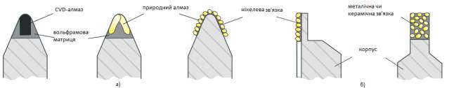 Дані інструменти виготовляють з різних видів алмазів. Застосовуються як CVD/PKD-алмази, так і природні.