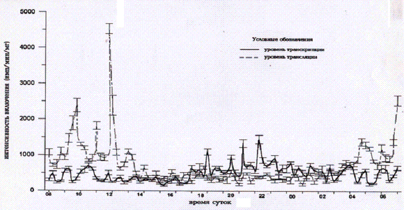 протяжении суток. Для изучения интенсивности транскрипции и трансляции брали