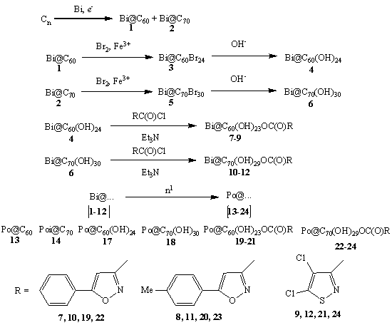 превращения эндоэдрических Bi209-содержащих соединений (1-12) в Po210-содержащие кластеры (13-24) или получения соединений (13, 14) электродуговым разрядом в