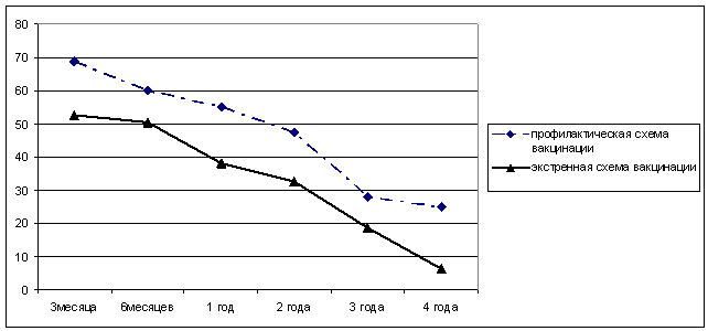 через 4 года 75,0±3,2 % вакцинированных по стандартной схеме и 93,6 ± 1,3%, вакцинированных по экстренной схеме не имели