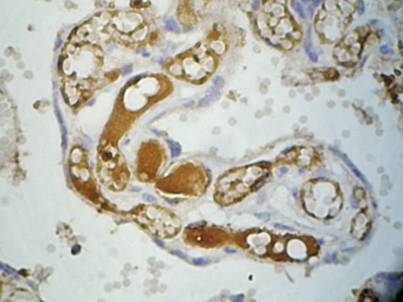ендотеліоцитах кровоносних судин хоріальних ворсинок, в окремих об'єктах