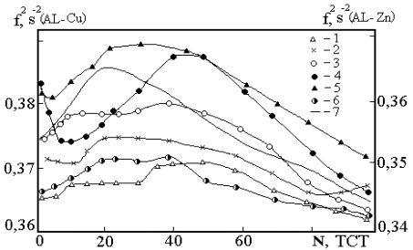 1 – Al-1%Cu; 2 – Al-2%Cu; 3 – Al-4%Cu; 4 – Al-1%Zn; 5- БрБ2; ТЦО в ПЗН: 6 – Al-1%Cu; 7 – Al-4%Cu.