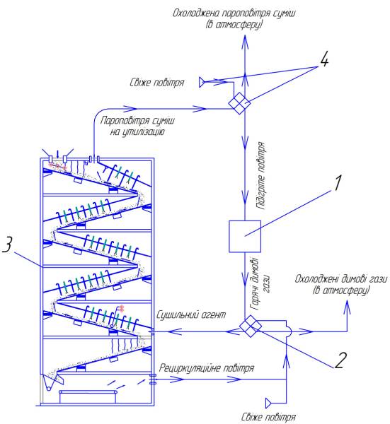 тепла; 2- теплообмінник; 3 – сушильне устаткування;